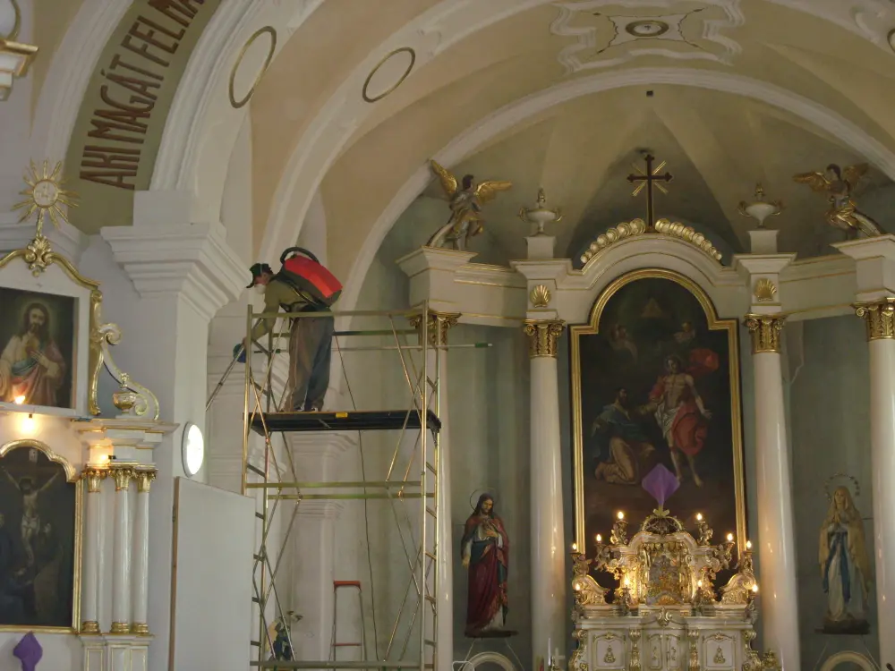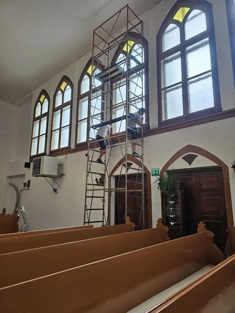 ✔ Curățenie generală în interior - Curățarea și igienizarea băncilor, altarelor, amvonului, statuilor și icoanelor, curățarea podelei (din piatră, lemn sau marmură) cu produse adecvate care nu deteriorează materialele, curățarea pereților, inclusiv a frescelor și a altor elemente decorative, folosind produse delicate și eficiente.
